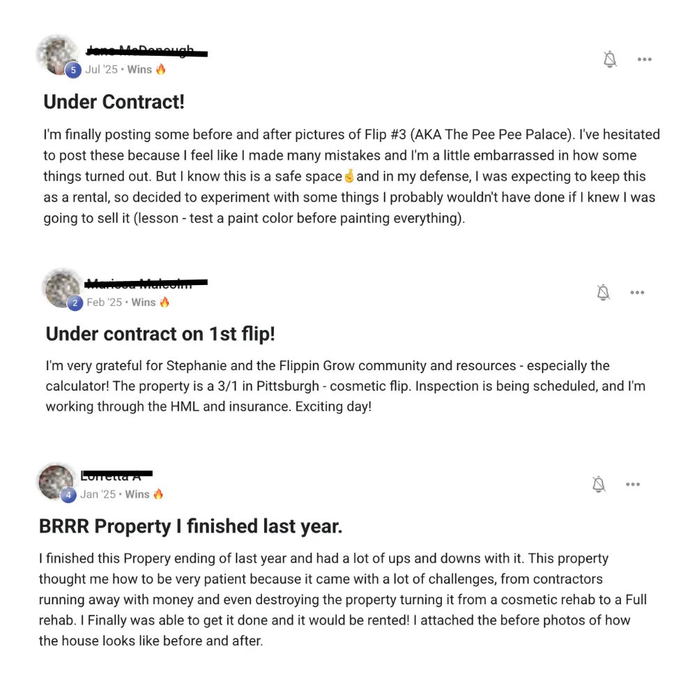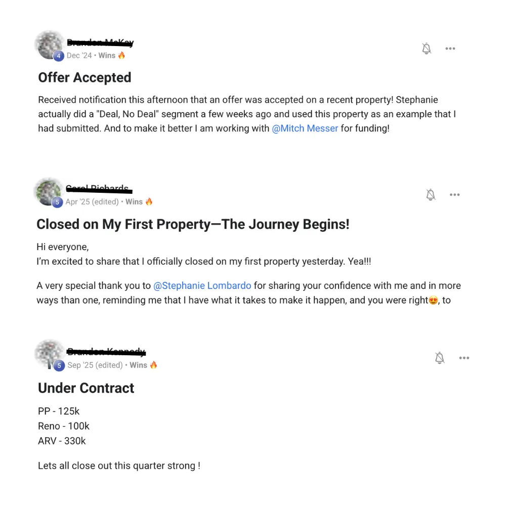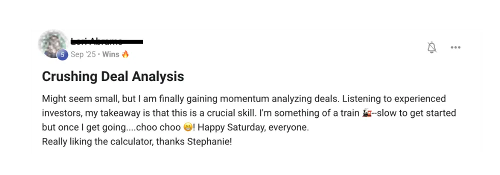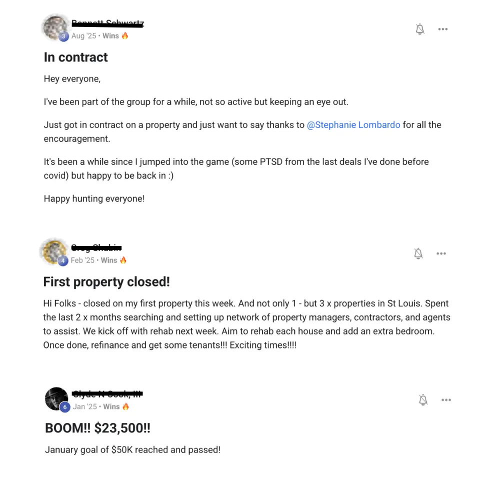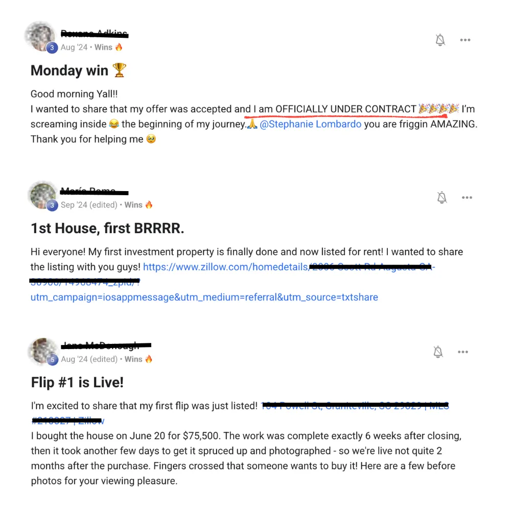 "This is a place for all investors. Currently there are people that are just thinking about buying their first properties, people that are writing their first offers and then someone that already owns a couple of investments. But we’re all learning something. It’s a great program to inspire action and feel supported. I highly recommend it." - Sarah L